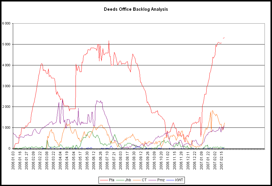 The Backlog statistics shows the trend of the total number of documents outstanding at the five Deeds Offices since the start of 2006. Pretoria is way in the lead as a result of the bigger volumes with which they have to deal. Service levels, which improved markedly towards the end of last year, have deteriorated over the past couple of months.